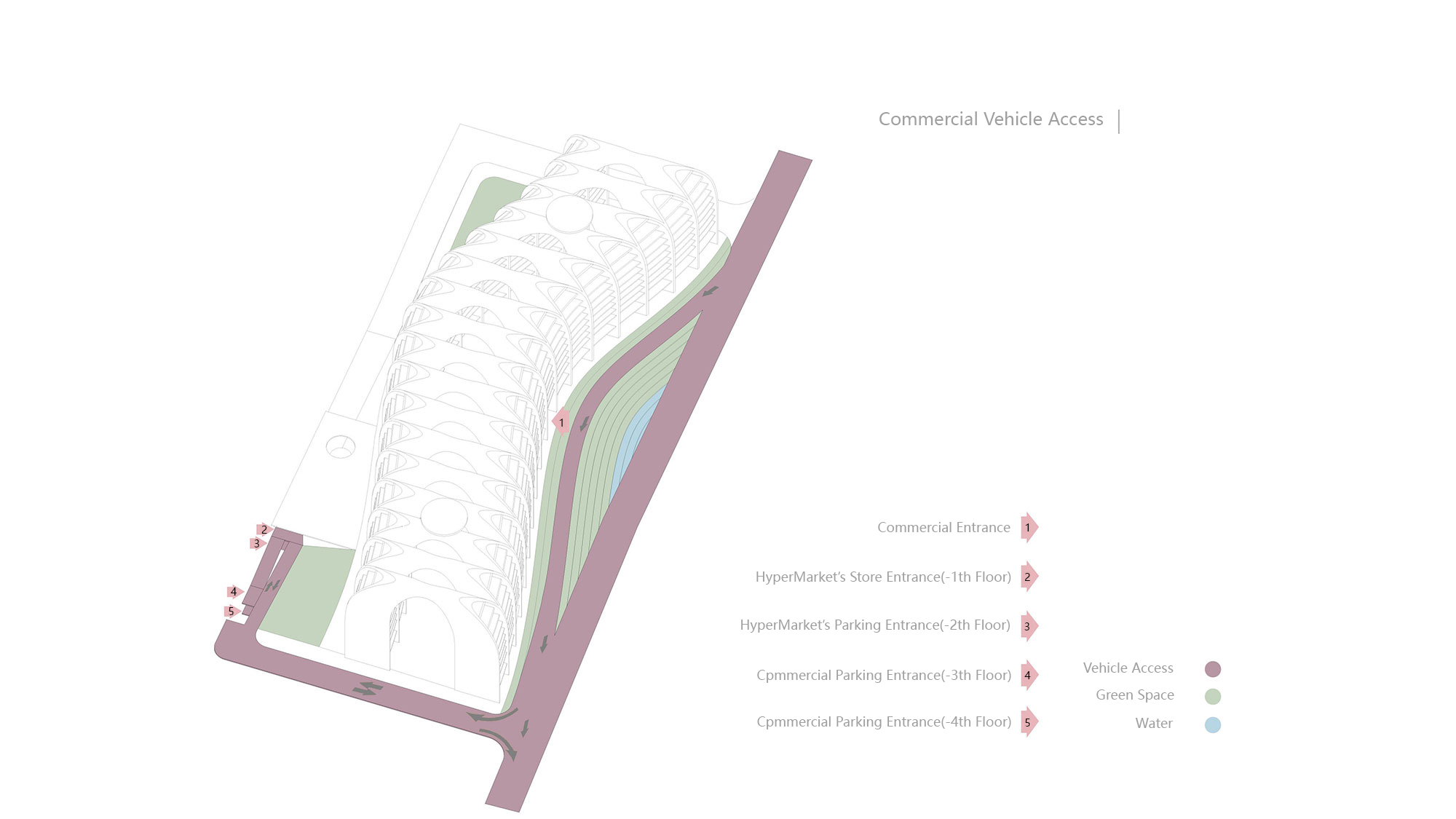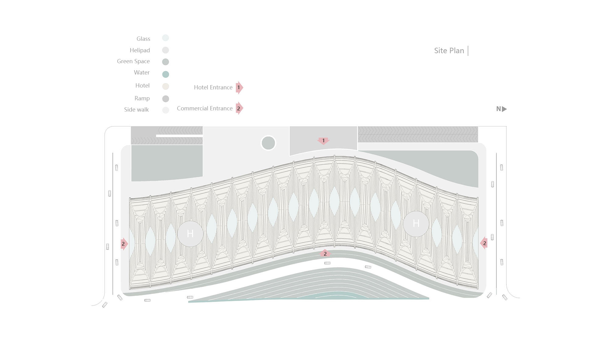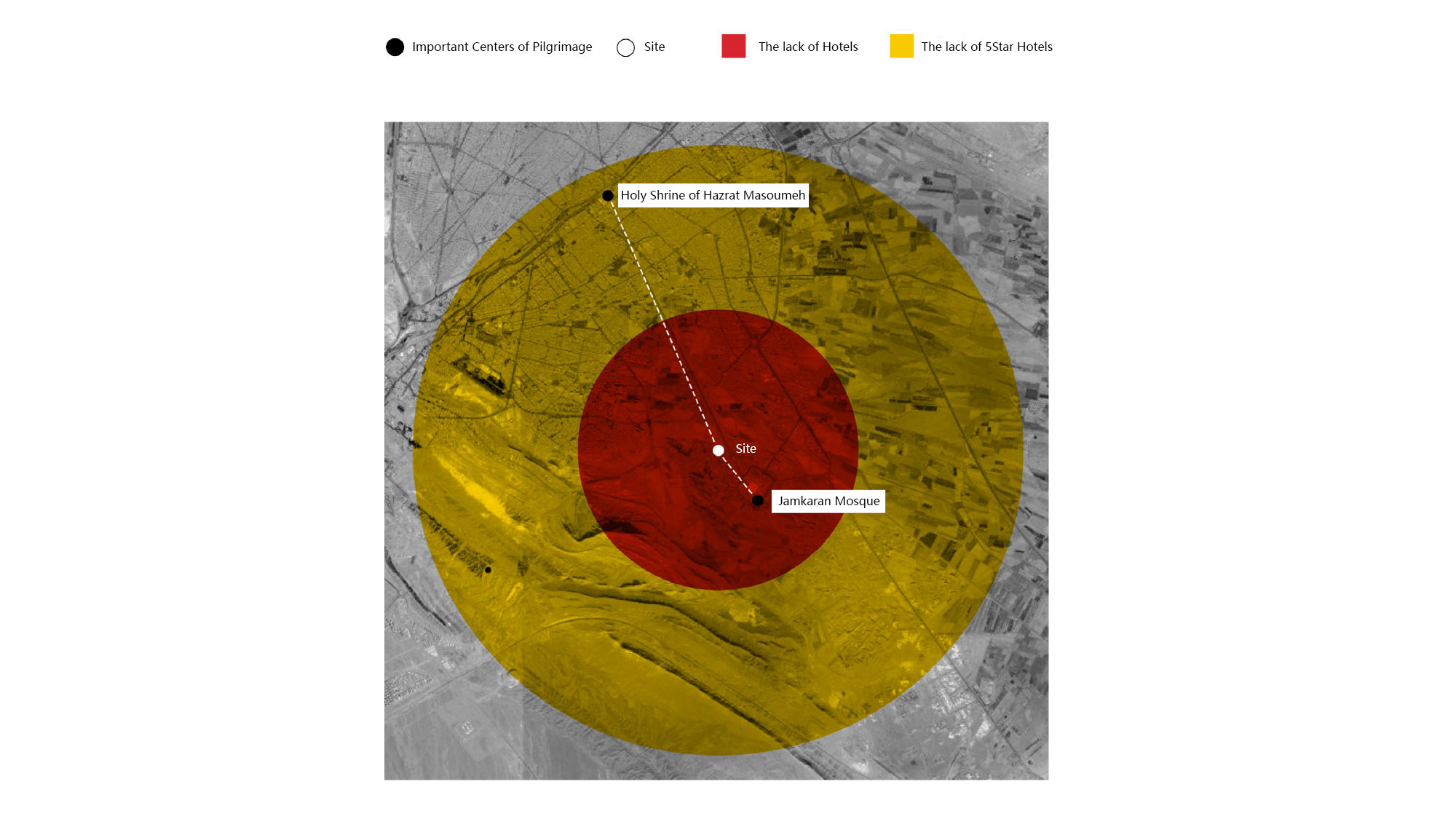 The proposal’s core idea was to design a complex whose buildings are in alignment with those located on the route to Holy Shrine of Fatima Masumeh (PBUH) and Jamkaran Mosque rather than a separate element from this spiritual route. For this purpose, by integrating the building’s communal area and placing it as a void in the middle of the proposed site, a path was formed in the middle of the building along Jamkaran Mosque towards Holy Shrine of Hazrat Masumeh. Creating this void in the middle of the site, has flawlessly dissolved the hotel’s intricate physical scheme and the commercial complex. Also, to provide the best possible view of the sacred Jamkaran Mosque and Holy Shrine of Hazrat Masumeh, this void was turned from a straight line to a curve.