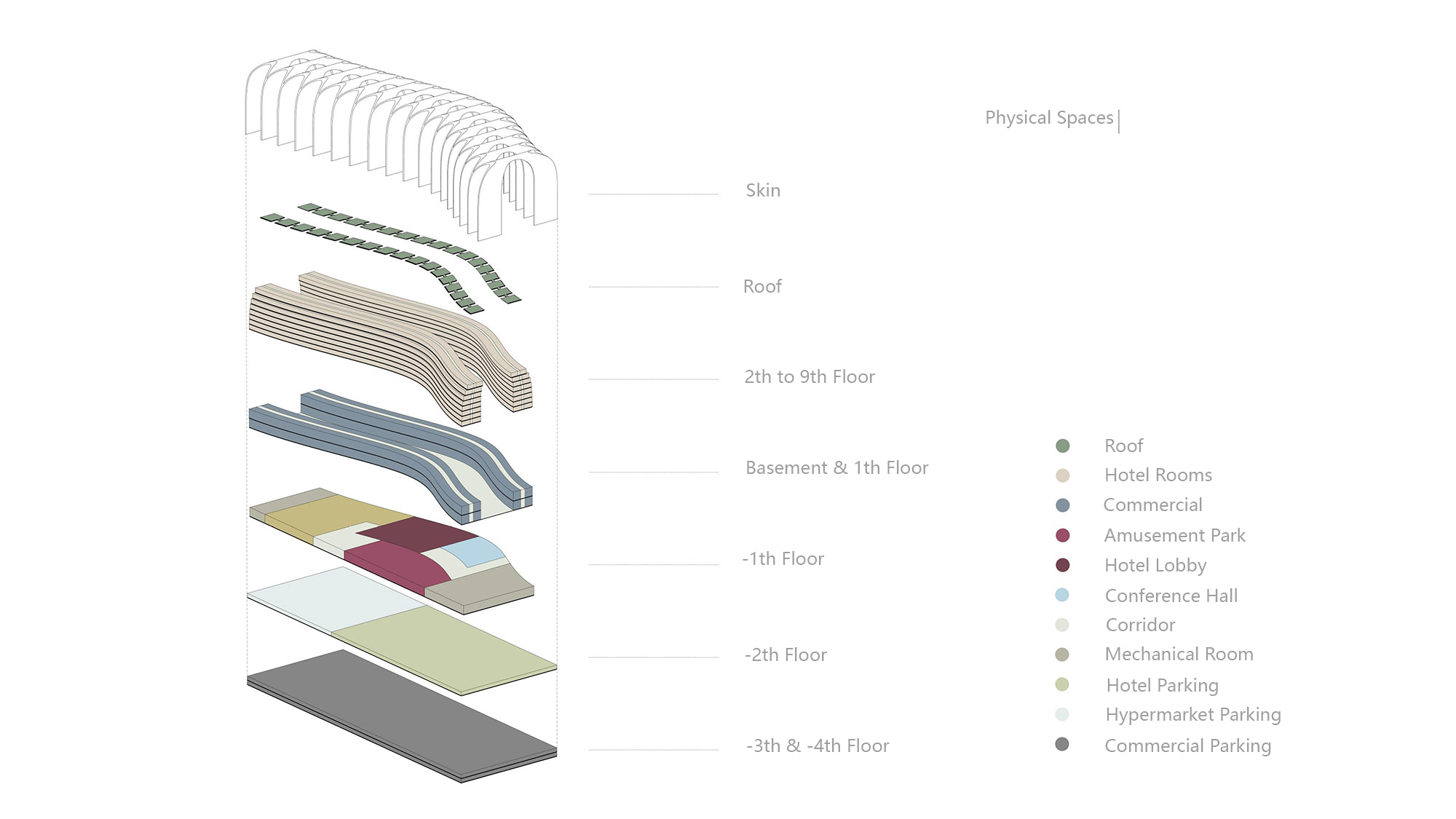 The curve has provided a better view especially to Jamkaran Mosque which is closer to the proposed site. It has also provided better alignment of the building with the direction of sunlight. Another advantage of curving the internal void is to create a public space in front of the proposed site which is linked to the walkway between Jamkran Mosque and Holy Shrine of Hazrat Masumeh. To shape the built area around the internal void area, an arc was used as the most important symbol of Iranian Islamic architecture. In this project, Main attempt was dedicated to arc not only as a decorative element, but also as the most crucial redefining in shaping the space. The space belonging to the hotel and commercial complex are both formed within these arcs.