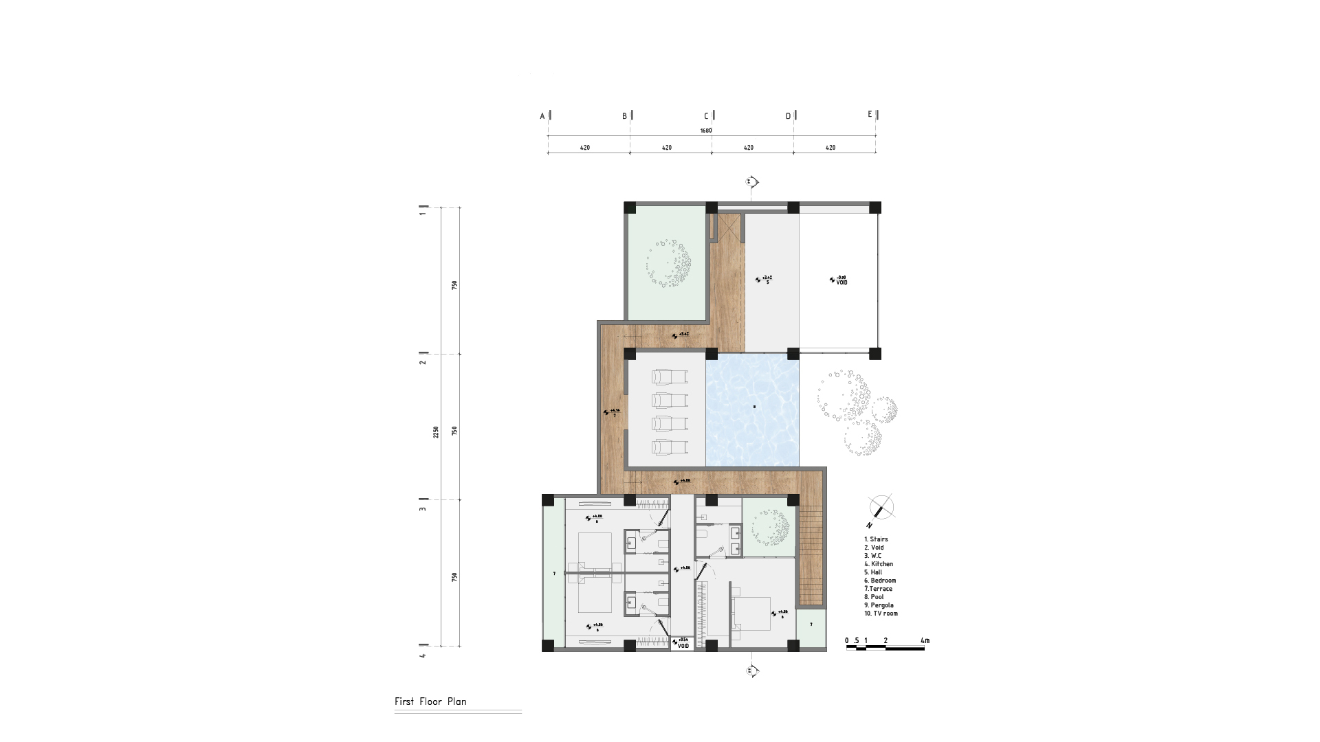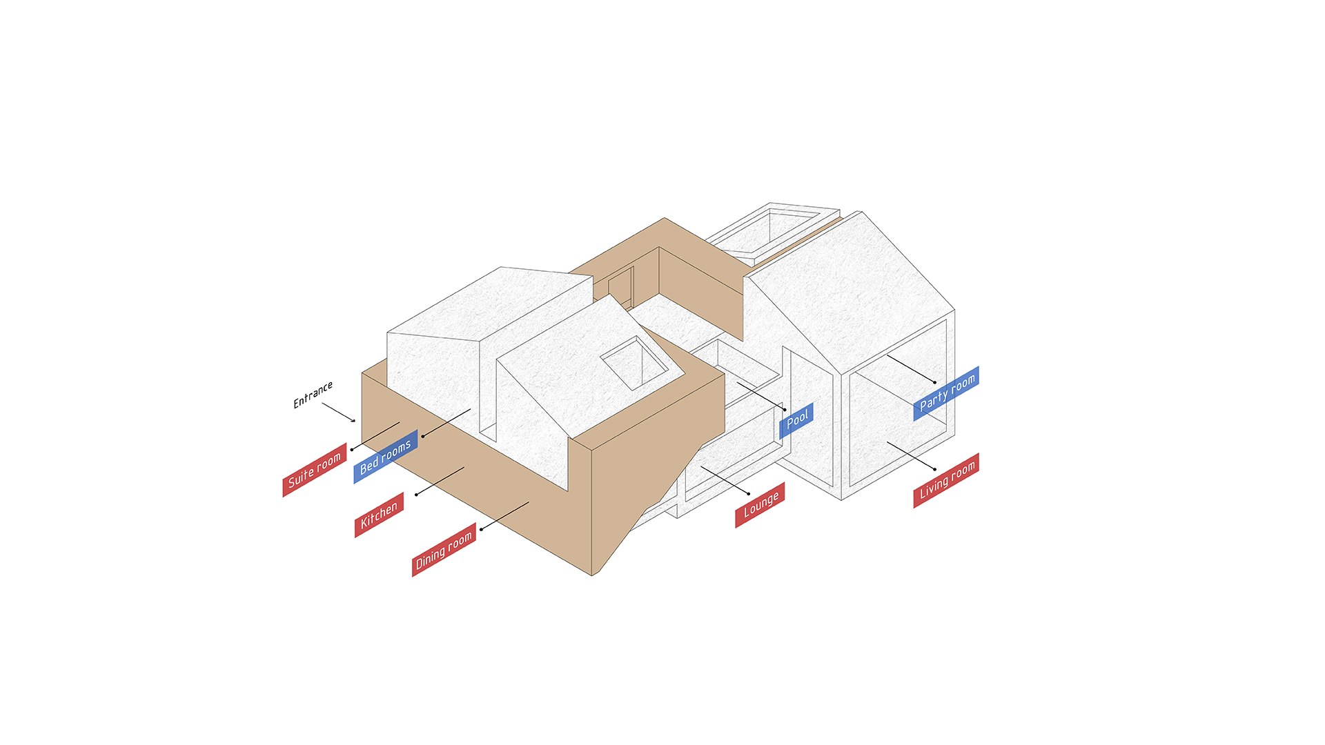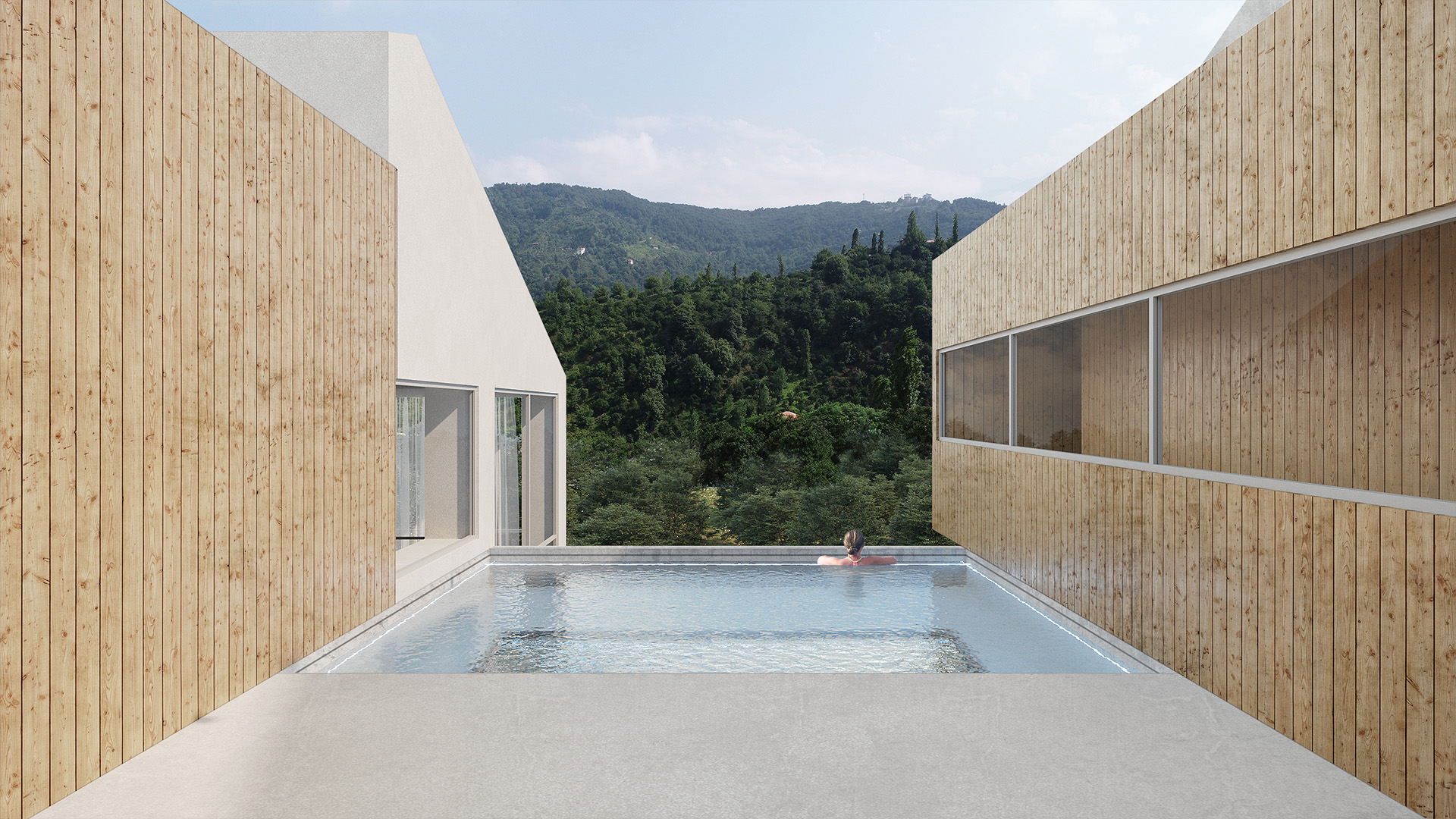 In this regard, a simple volume A frame in two floors was defined based on construction. Then, similar to the central courtyard, this volume was reduced and instead of the central courtyard, a pool was defined in the middle of the building on the first floor in order to have the most privacy while using the view.