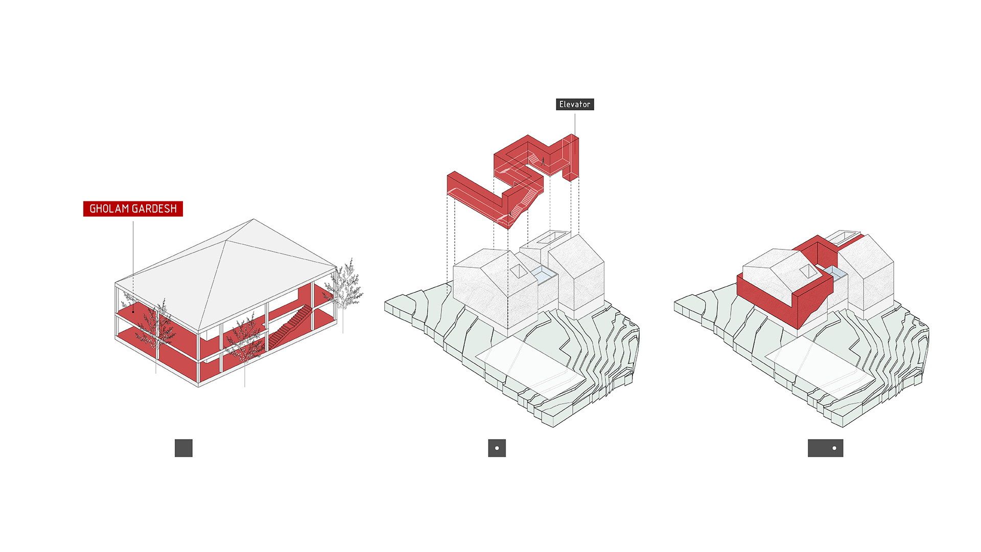 Another issue in the northern houses that has been redefined in this project is “gholam-gardesh”. The gholam-gardesh were outside of the building, but in this project it moves like an alive creature with a different material inside and outside the project and plays a role and reveals different sequences of the project to the user.
