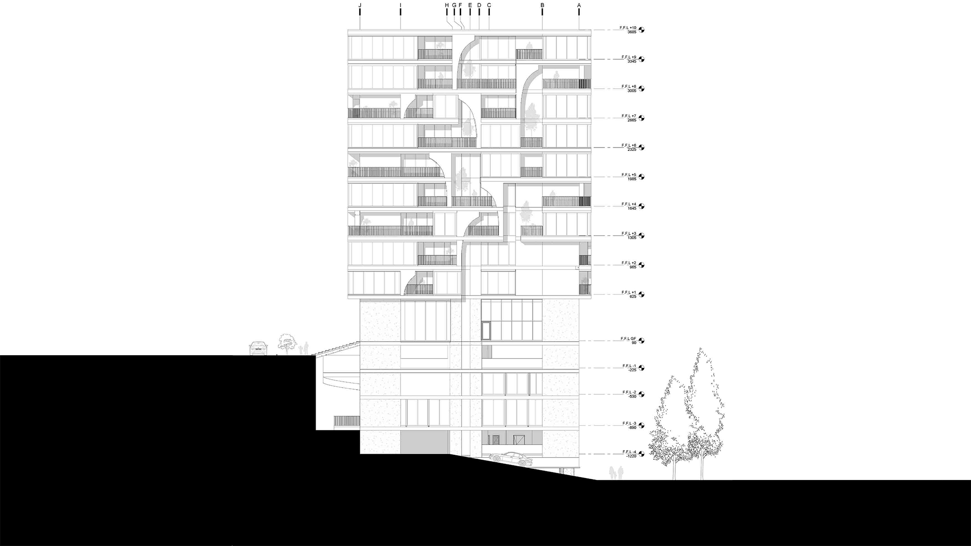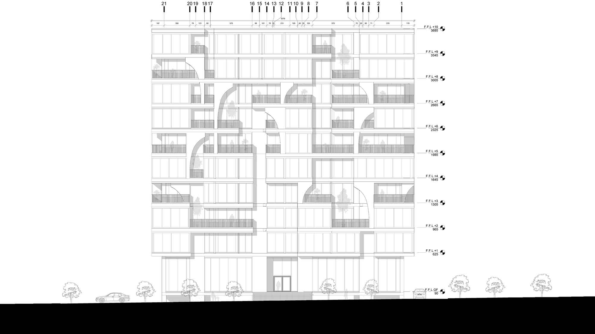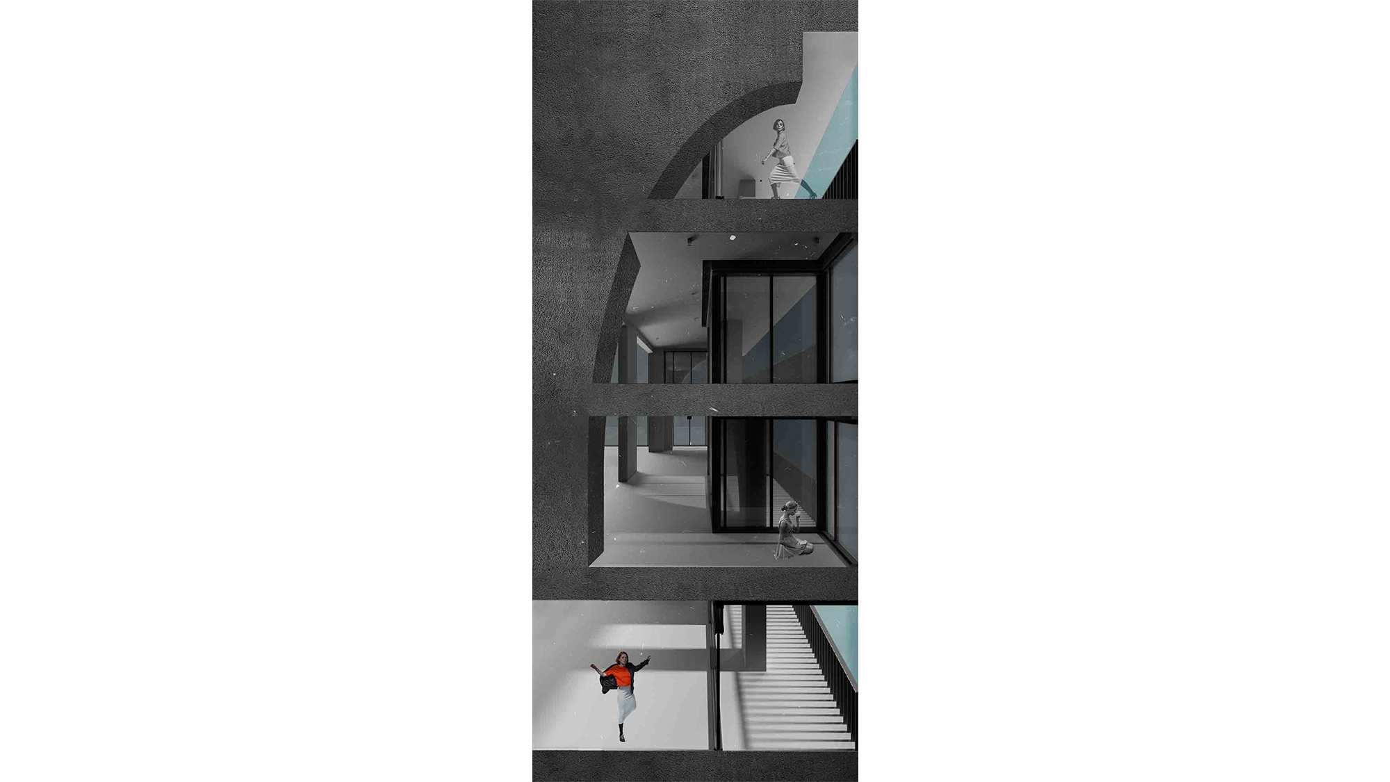 "لایه ها" را در این پروژه مطرح کردیم. کانسپت لایه ها شامل المان هایی از قبیل دیوار پرده ای (کرتین وال)، قطاعی از طاق ، پنجره و دیوار برشی از بیرون به درون است. تمام این عناصر روی کنسول های نما و در بخش هایی تا عمق 3 متری پروژه از سطح جداره امتداد پیدا می کند. این ما را به طراحی یک فضای انعطاف پذیر هدایت می کرد که کاربر نهایی می توانست فضا را طبق خواسته ی خود سازماندهی کند. سپس به بازطراحی فضاهای داخلی و هماهنگ سازی آن با نمای جدید پرداختیم. در ادامه، مجبور شدیم که سیستم مکانیکی پروژه را با طرح جدید تطبیق دهیم. نتیجتا به جای نمای تخت و دو بعدی متداول، به یک نمای پویای سه بعدی دست پیدا کردیم که فضایی بینابینی را برای استفاده کاربر فراهم می کند و استفاده کنندگان ضمن حفظ حریم می توانند از فضای محیطی واحد خود به طور مستقل استفاده کنند.
