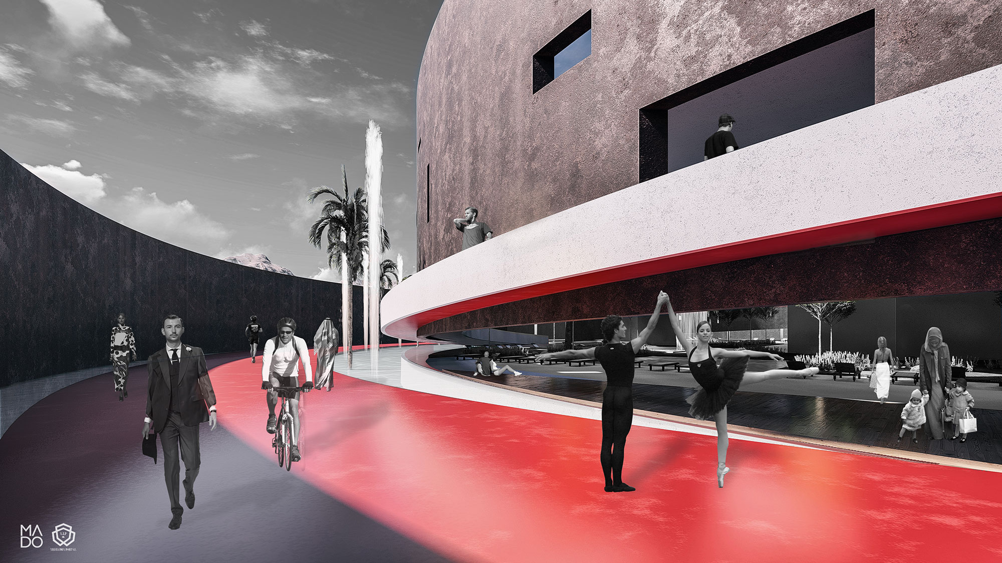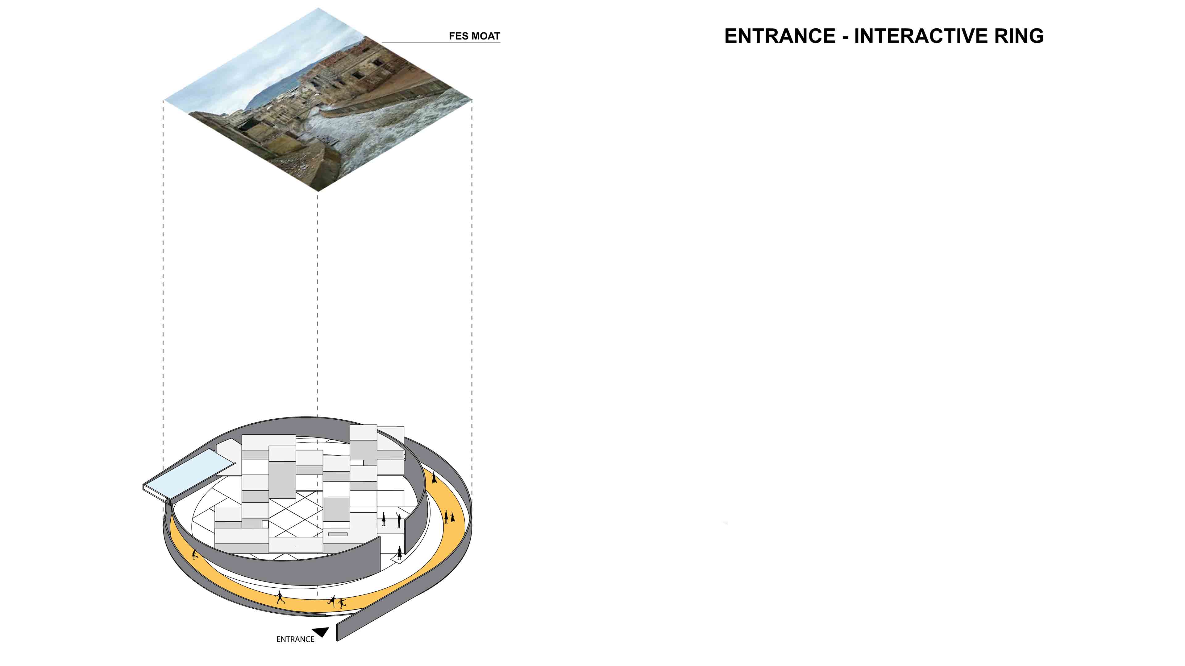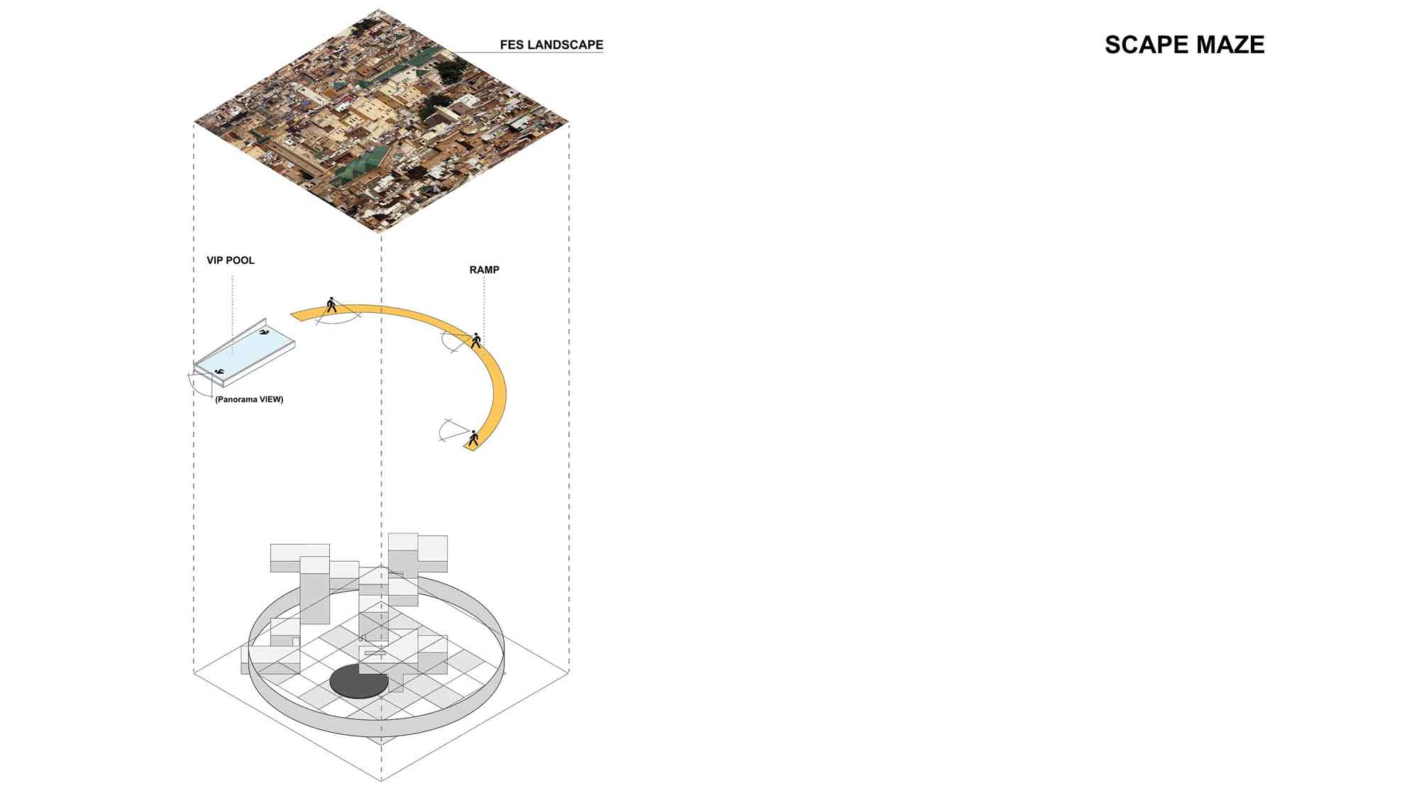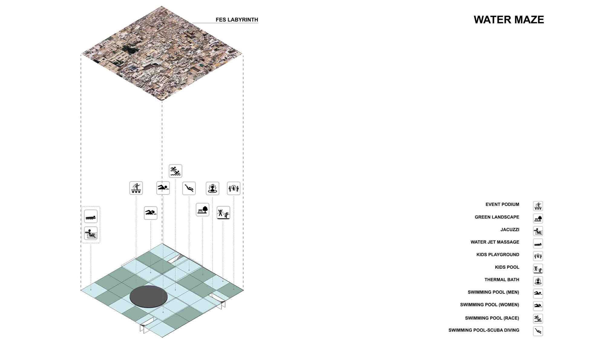 استخراج شد ، مفهوم هزارتو (Maze) بود که به ساختار بی نظم و هرج و مرج درون شهر فاس می پردازد . مفهوم دیگر مفهوم چند رگه بودن معماری مراکش است که در طول تاریخ تحت تاثیر معماری قوم های مختلف مانند بربرها ،اسپانیایی ها و مسلمان ها بوده است .در نهایت پروژه مجموعه ورزش های آبی به مثابه یک هزارتو چندرگه(Hybrid Maze)تعریف شده است